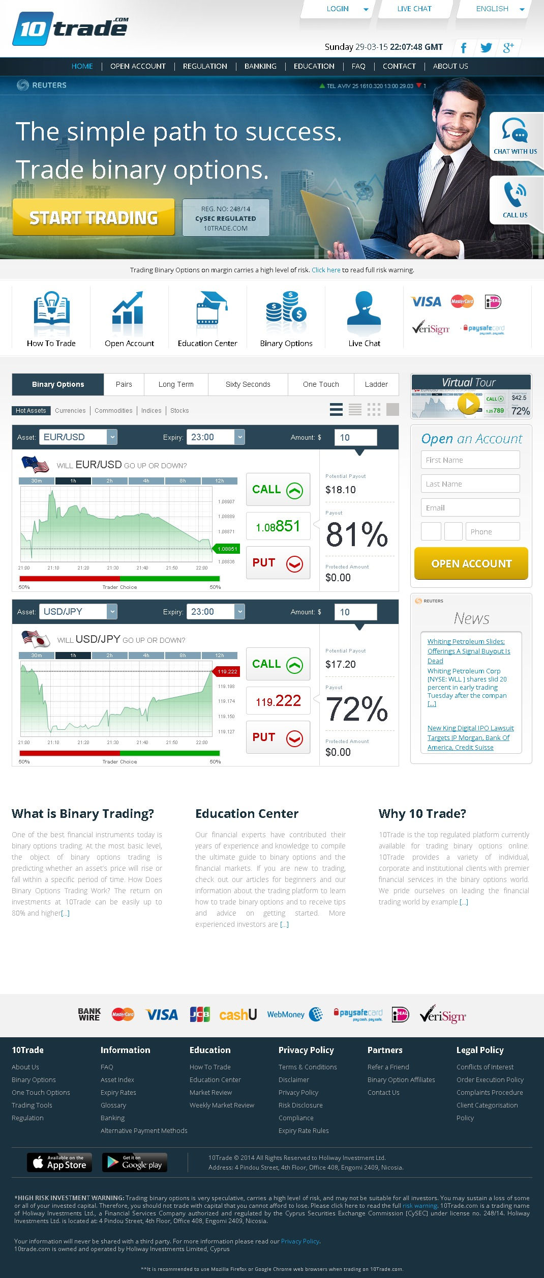 Traders in search of a regulated binary options broker with a lot to offer will want to take a look at 10Trade. 10Trade was founded in 2014 in Nicosia, Cyprus, by a company called Holiway Investments, Ltd. 10Trade operates under CySEC license #248/14. As such, they unfortunately do not accept traders from the USA, but they may be a great choice if you are located internationally.