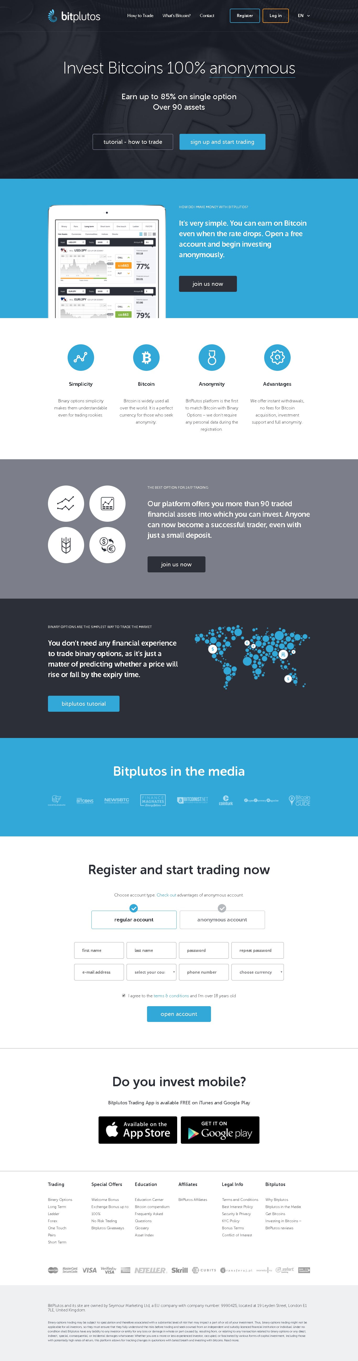 If there are two types of trading which are trending right now, they are binary options and cryptocurrency exchange. So it is not surprising that we would see a binary options broker which is now offering trading in Bitcoin. BitPlutos is a unique broker which specializes in just that. It is operated by Seymour Marketing Ltd., a company based in London, though the parent company is the same one that runs the Exbino binary options website. Let’s see what it has to offer.