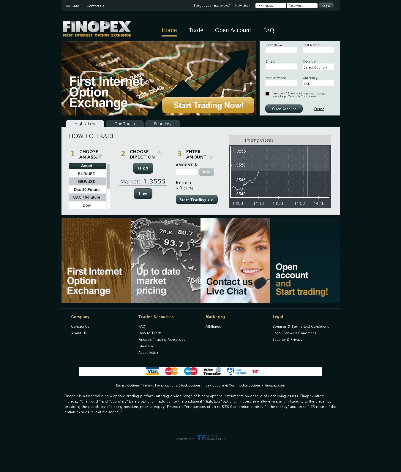 TechFinancials powers the platform. You may not be as familiar with this platform as with SpotOption, but several other brokers use it as well. You’ll see that you can trade High/Low, One Touch, Boundary, and 60 Seconds options. There are 39 different trading instruments including currencies, stocks, indices, and commodities. The minimum and maximum trade sizes are listed nowhere on the website or anywhere else online, but are $25 and $1,000 respectively.