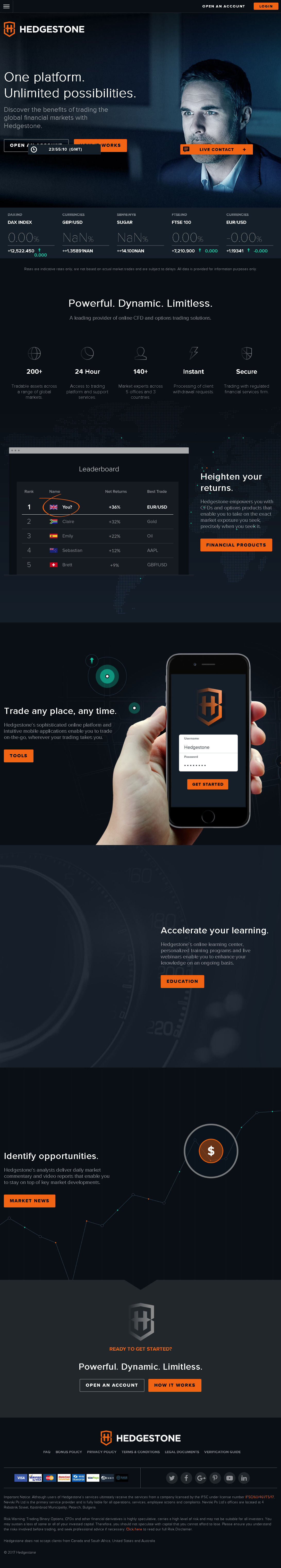 Hedgestone is a binary options broker which is owned and operated by a Bulgarian company Nevski Ps Ltd. Although the company provides the trades are cleared by the Belize registered Icon Markets Limited, the customers deal only with unregulated Nevski Ps Ltd. Icon Markets Limited is regulated by the Belize International Financial Services Commission (IFSC) under license #IFSC/60/461/TS/17. Traders in most countries around the world are welcome, but Hedgestone does not take traders from the USA, Australia, Canada, or South Africa.